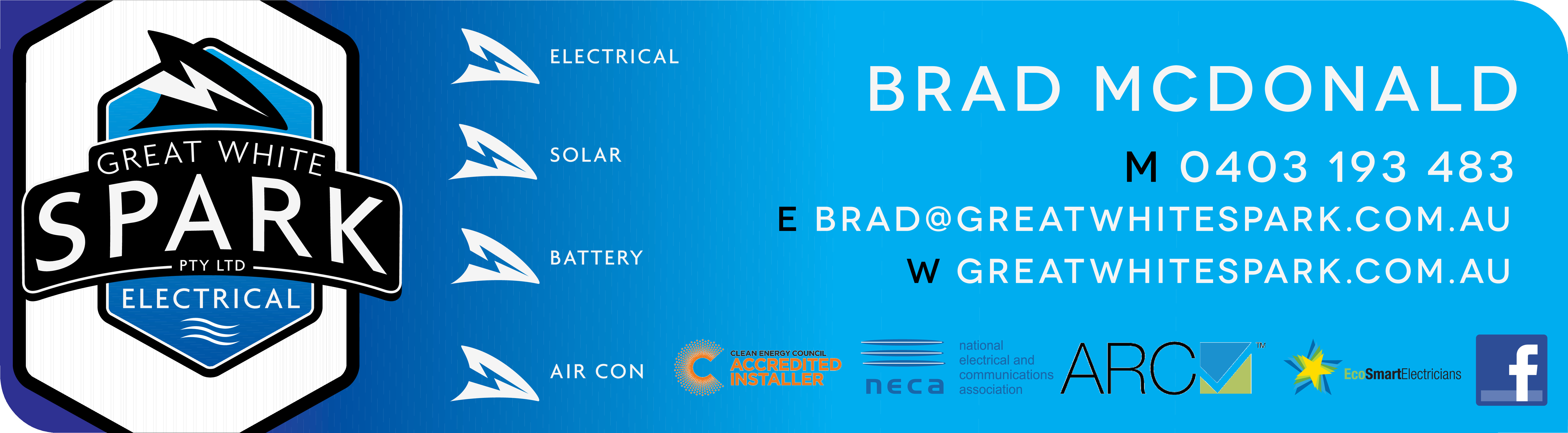Great White Spark is your qualified experienced team for your domestic and commercial electrical needs, servicing Victoria and NSW. 20 plus years on the job with a passion for new technology and challenges. Electrical, Solar, Battery and Air Con. Greatwhitespark.com.au is where you need to headGreat White Spark Electrical.
